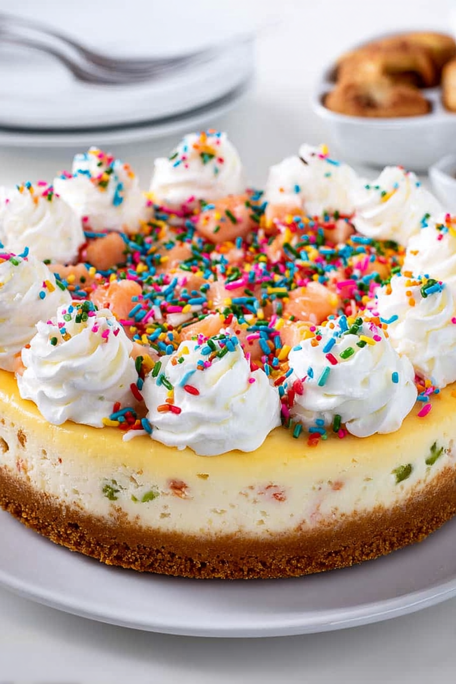 Once cooled, cover the cheesecake with plastic wrap and refrigerate for at least 4 hours, or preferably overnight. This allows the flavors to meld and the cheesecake to set completely. Before serving, remove the cheesecake from the springform pan and decorate the top with colorful sprinkles.