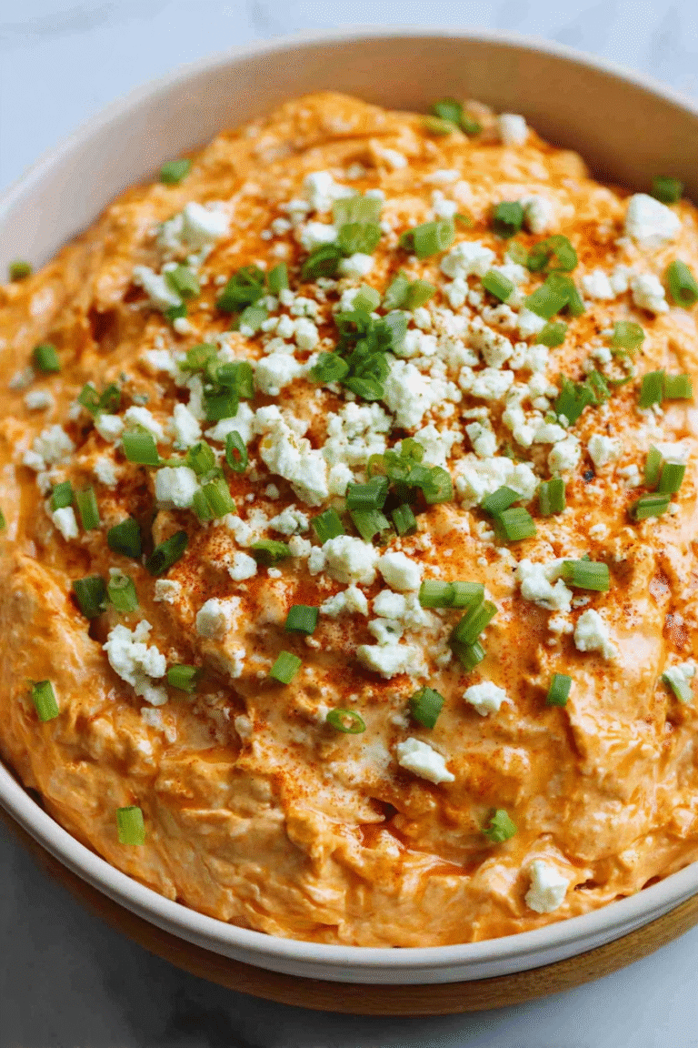 Once the dip is baked to perfection, let it cool slightly before garnishing with fresh green onions. Their vibrant green adds a pop of freshness and color, enhancing the visual appeal of your masterpiece. Serve it warm with tortilla chips, celery sticks, or your favorite dippers. The presentation is just as important as the taste, and a generous sprinkle of green onions elevates your Buffalo Chicken Dip to new culinary heights. Get ready for oohs and aahs.