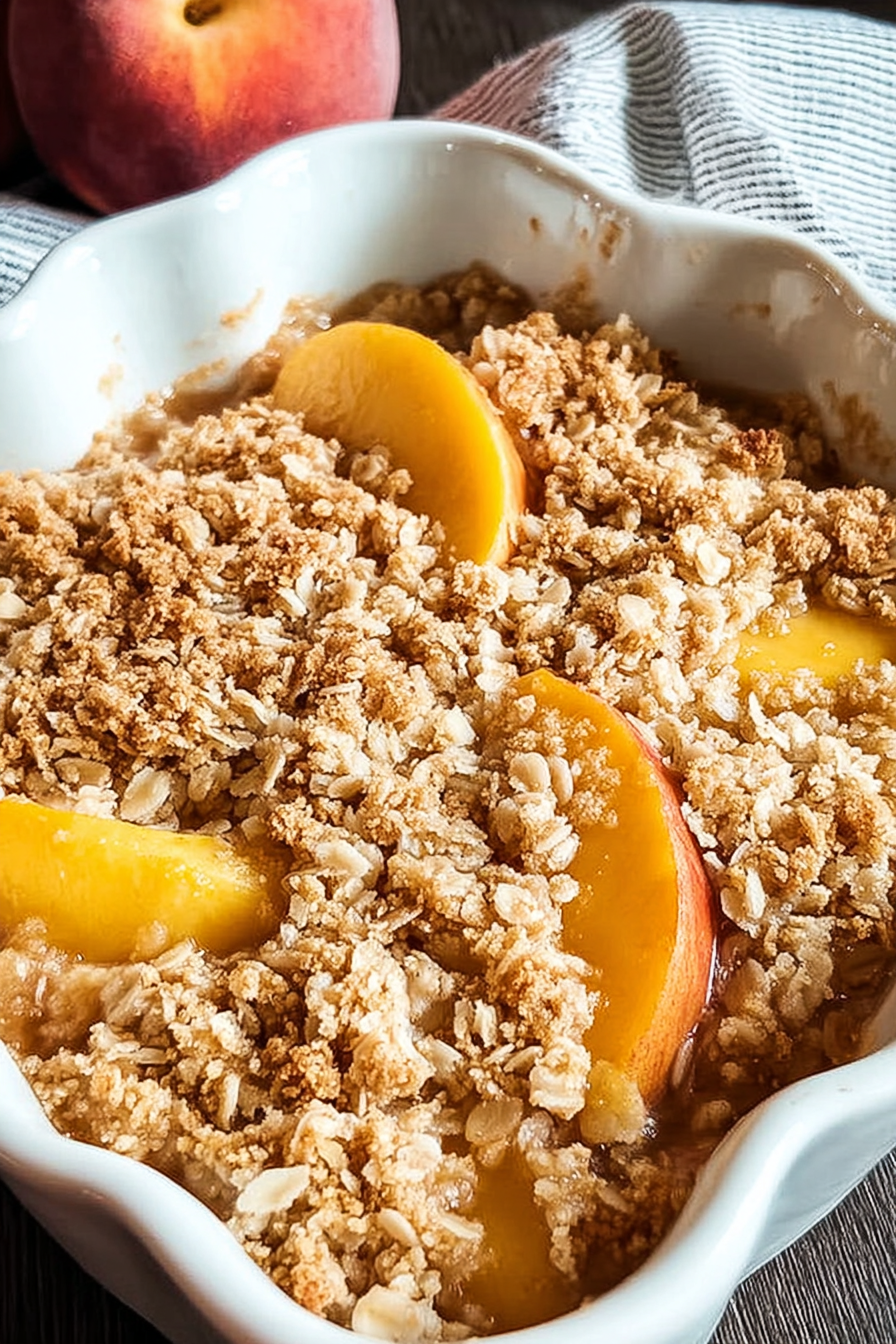 Or, if you’re a fan of tropical flavors, you could make a **peach and coconut crisp**. Add a half cup of shredded coconut to the topping and a tablespoon of coconut extract to the peach filling.